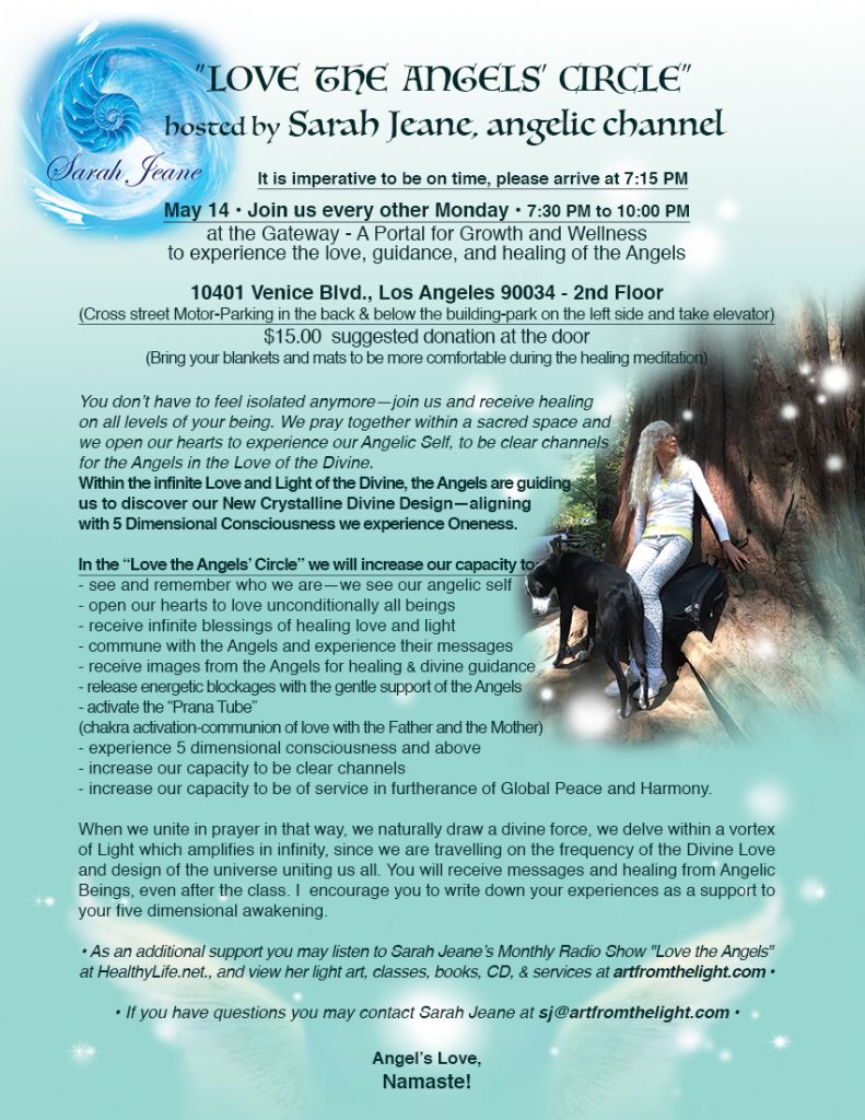 “LOVE THE ANGELS CIRCLE” with Sarah Jeane • May 14, 2018 • Join us every other Monday • 7:30 PM to 10:00 PM at the Gateway, A Portal for Growth and Wellness to experience the love, guidance, and healing of the Angels • NEW LOCATION: 10401 Venice Blvd., Los Angeles 90034 • 2nd Floor (Cross street Motor-Parking in the back & below the building-park on the left side and take the elevator) $15.00 suggested donation at the door (No one tuned away) • You don’t have to feel isolated anymore—join us and receive healing on all levels of your being. We will pray together, and open our hearts to be conduits, clear channels to the Angels in the Love of the Divine. We will delve in that Love! • As an additional support you may attend Sarah Jeane’s classes, view her books, CD, and services at artfromthelight.com • Contact Sarah Jeane: sj@artfromthelight.com