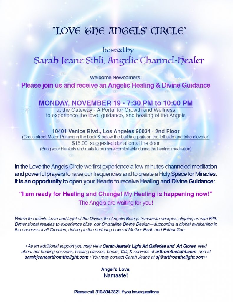 “LOVE THE ANGELS CIRCLE” with Sarah Jeane • NOVEMBER 19, 2018, join us from 7:30 PM to 10:00 PM at the Gateway, A Portal for Growth and Wellness to experience the love, guidance, and healing of the Angels. • NEW LOCATION and directions: 10401 Venice Blvd., Los Angeles 90034 • 2nd Floor (Cross street Motor – Parking in the back & below the building-please park on the left side and take the elevator to the 2nd floor) $15.00 suggested donation at the door (No one tuned away) • You don’t have to feel isolated anymore—join us to receive Multidimensional Healing! “I AM READY FOR HEALING AND CHANGE! MY HEALING IS HAPPENING NOW!” • As an additional support you may view Sarah Jeane’s Light Art, read about her private healing sessions, and healing empowering classes, books, CD, and services at artfromthelight.com • You may visit Sarah Jeane New Art Store and Galleries at: sarahjeaneartfromthelight.com • You may contact Sarah Jeane at sj@artfromthelight.com