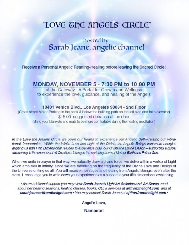 • NOVEMBER 5, 2018, join us from 7:30 PM to 10:00 PM at the Gateway, A Portal for Growth and Wellness to experience the love, guidance, and healing of the Angels. • NEW LOCATION and directions: 10401 Venice Blvd., Los Angeles 90034 • 2nd Floor (Cross street Motor – Parking in the back & below the building-please park on the left side and take the elevator to the 2nd floor)