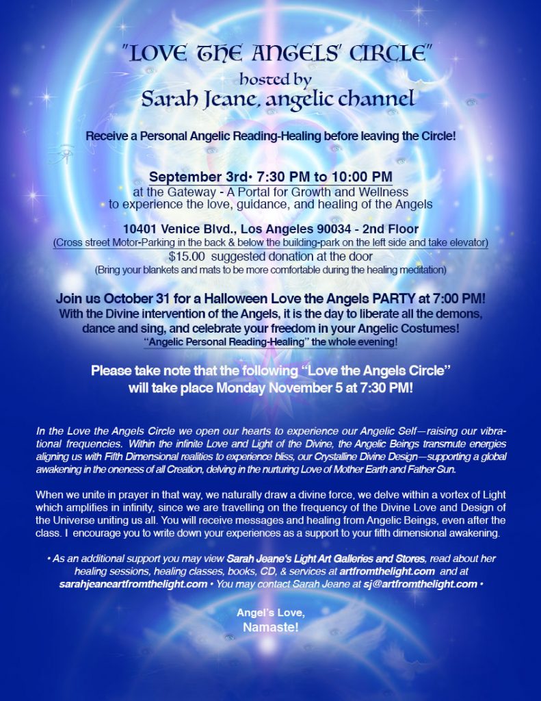 • September 3rd, 2018 • Join us from 7:30 PM to 10:00 PM at the Gateway, A Portal for Growth and Wellness to experience the love, guidance, and healing of the Angels. • NEW LOCATION and directions: 10401 Venice Blvd., Los Angeles 90034 • 2nd Floor (Cross street Motor – Parking in the back & below the building-please park on the left side and take the elevator to the 2nd floor) $15.00 suggested donation at the door (No one tuned away) • As an additional support you may view Sarah Jeane’s Light Art, read about her private healing sessions, and healing empowering classes, books, CD, and services at artfromthelight.com • You may visit Sarah Jeane New Art Stores and Art Galleries at: sarahjeaneartfromthelight.com • You may contact Sarah Jeane at sj@artfromthelight.com